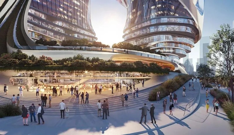 扎哈事務(wù)所的設(shè)計(jì)旨在創(chuàng)造一個(gè)新的地標(biāo),一組新的可識別的塔,讓建筑本身成為一個(gè)公共事件。方案完美地回應(yīng)了深超總城市規(guī)劃設(shè)計(jì)的“十字生境”理念,并與周邊的公園和廣場建立了直接的聯(lián)通關(guān)系——裙房梯田狀的空間形態(tài)將中央綠軸自然地引入裙房公共空間,提供直接的連續(xù)感,并通過塔樓設(shè)計(jì)使該空間不斷上升,使建筑整體與綠軸景觀無縫連接。