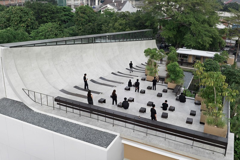 Aruma Split Garden是一個獨特的餐廳項目,占地 2500㎡。其屋頂最為特別,采用了階梯式設計,結合了屋頂、立面、墻壁、對角懸臂結構和家具等多種元素。