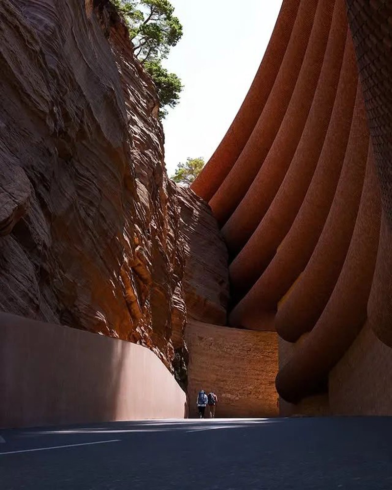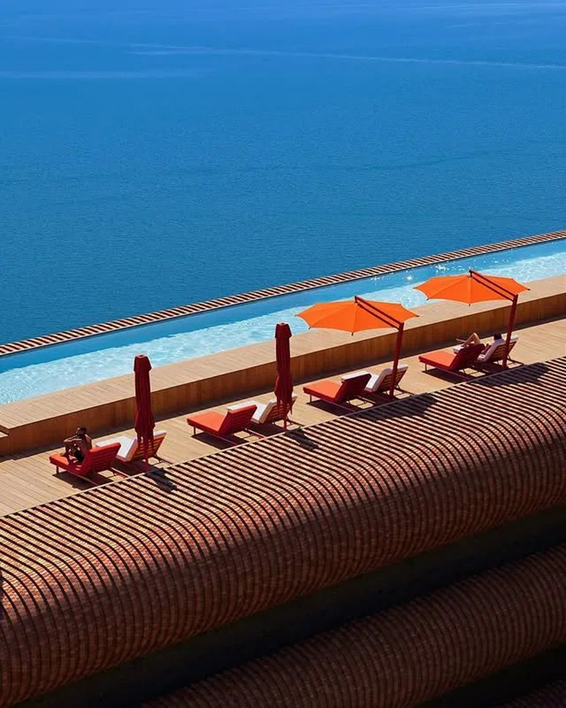 在懸崖之畔,建筑與自然相擁。盤旋的車道似絲帶纏繞山間,錯(cuò)落的建筑如精巧積木嵌入綠意。車輛靜臥其中,行人悠然漫步,山海為幕,奏響一曲人類巧思與自然壯麗的和諧樂章。